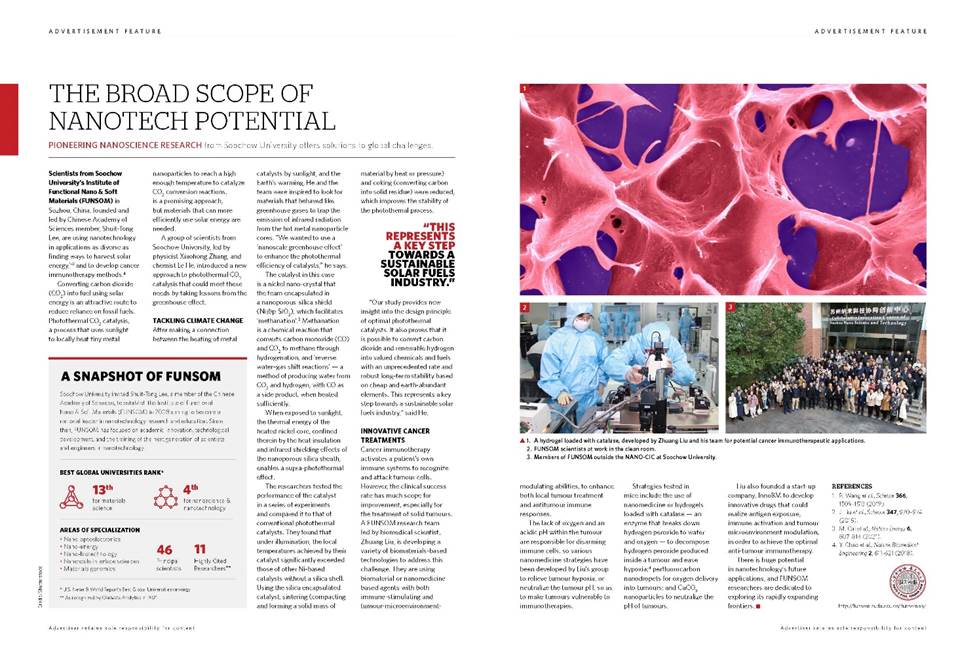 On August 11th, the major landmark scientific research achievements in nanotechnology made by Soochow University were reported with the title of “Pioneering nanoscience research from Soochow University offers solutions to global challenges” by Nature. Professor He Le and Professor Liu Zhuang from Institute of Functional Nano& Soft Materials at Soochow University were invited to be interviewed to introduce the latest research progress of the Institute researchers in two representative fields of using nanotechnology to tackle climate change and innovative cancer treatments.